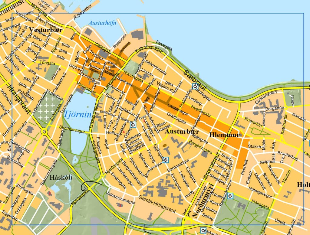 A map of Reykjavik central. The red numbers show: